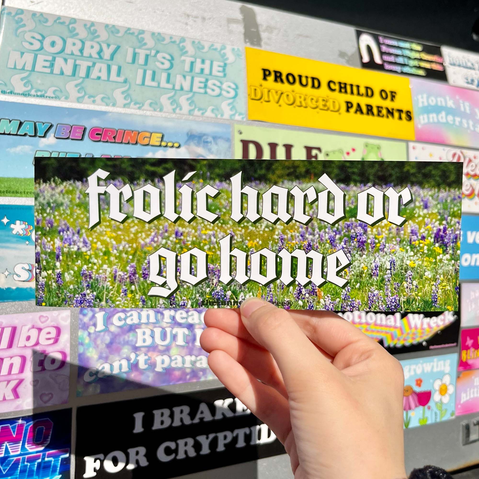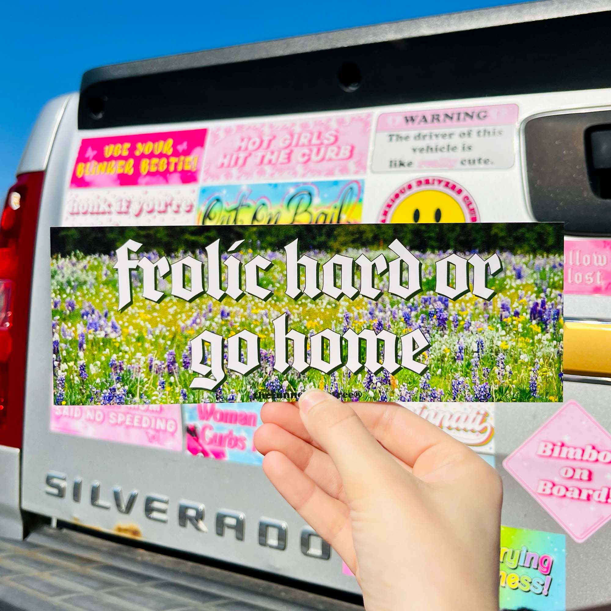 Glossy waterproof bumper sticker for the whimsical overachiever, frolic like you mean it.