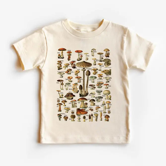 Mushroom Lover Youth Tee. Natural Color 100% Ring Spun Cotton Tee. Printed with Vintage Realistic Mushroom Illustrations.